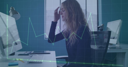 Image of financial data processing over caucasian businesswoman in office. Global networks, computing, business, finance and data processing concept digitally generated image.