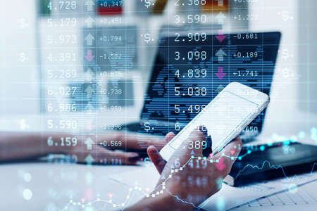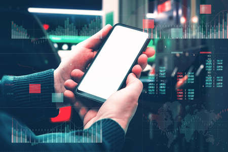 Trader holding in the hands a smart phone and researching stock market to proceed right investment solutions. Internet trading and wealth management concept. Hologram Forex chart over close up shot.