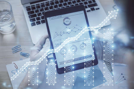 Double exposure of mans hands holding and using a digital device and forex graph drawing. Financial market concept.