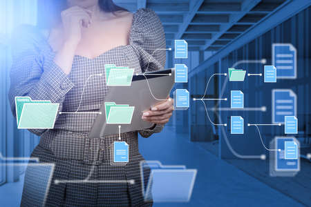 Businesswoman hand touch folder of document Management System, online documentation database and process automation to efficiently manage files work, knowledge, Corporate business technology.