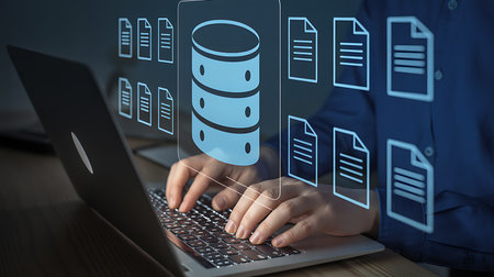 Document management. Document file information and folders icons with businessman hands working on laptop computer, online digital databases, data systems, and business internet technology concepts.
