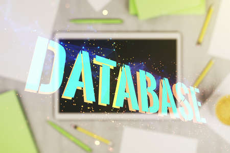 Double exposure of Database word sign and modern digital tablet on background, top view, global research and analytics concept