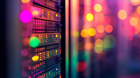 A close-up view of a data center server rack with vibrant red and blue LED lights, symbolizing network infrastructure and technology.