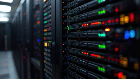 data center with floor-to-ceiling racks of servers and blinking lights, created with generative ai