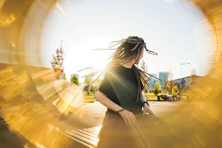 Portrait of young happy woman with dreadlocks in the park. Dreadlocks fly in different directions. Golden frame around woman.