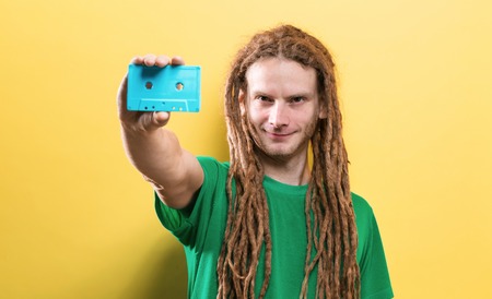 Happy man holding a retro cassette tape on a yellow background