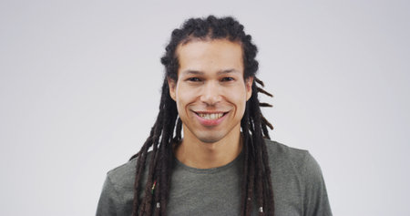 Hair care, happy and man with portrait in studio for dreadlocks growth, maintenance or scalp health. Mockup space, person or smile on white background for hairstyle, salon treatment or grooming pride