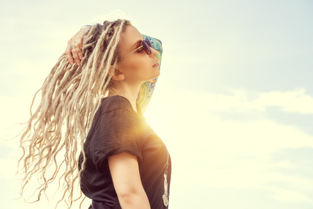 Modern girl with long blonde dreadlocks standing outdoor over blue sky. Boho style fashion.