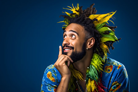 Happy young African man in Hawaiian necklace standing against red background : Generative AI