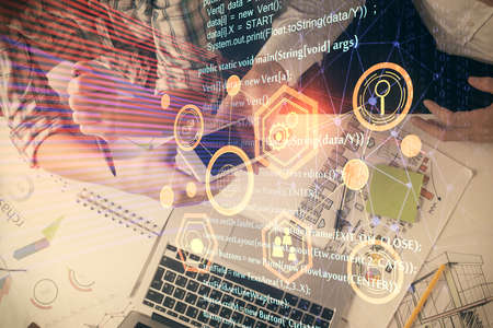 Double exposure of desktop computer and technology theme hologram. Concept of software development.