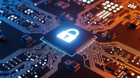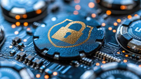 Close up of a computer chip with a lock symbol on a colorful circuit board background