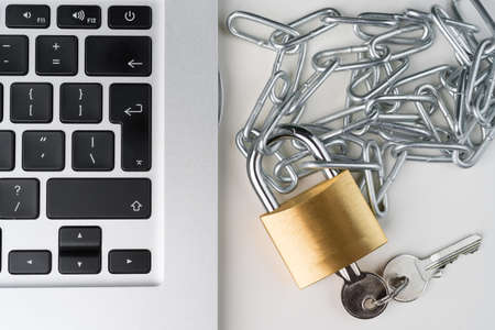 Padlock, chain and keys with laptop computer on a white background. Cyber security abstract concept.