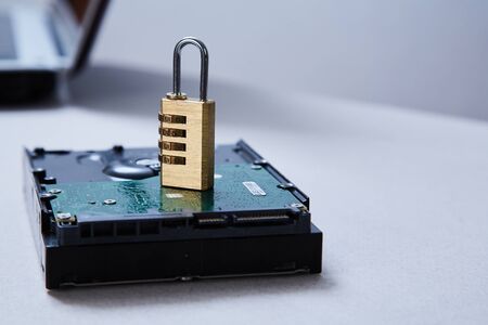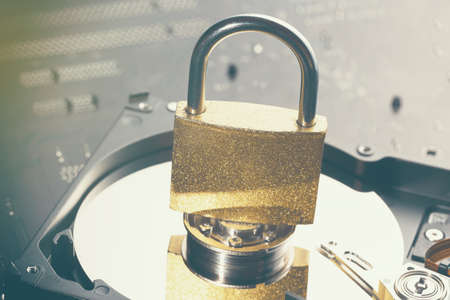 Padlock on computer hard disk drive HDD. Internet data privacy information security concept