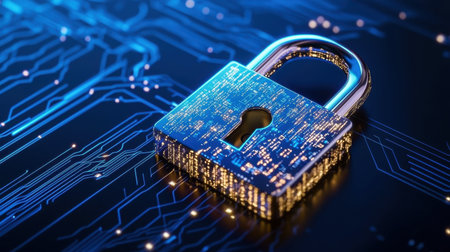 This image features a shiny digital padlock on a blue circuit background, representing concepts of cybersecurity and data protection in a modern technological landscape.