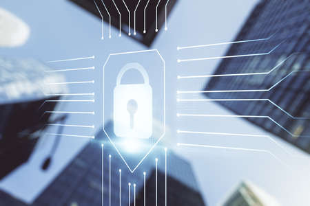 Virtual creative lock symbol and microcircuit illustration on office buildings background. Protection and firewall concept. Multiexposure