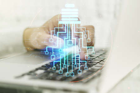 Creative light bulb illustration with microcircuit and hands typing on computer keyboard on background, future technology concept. Multiexposure