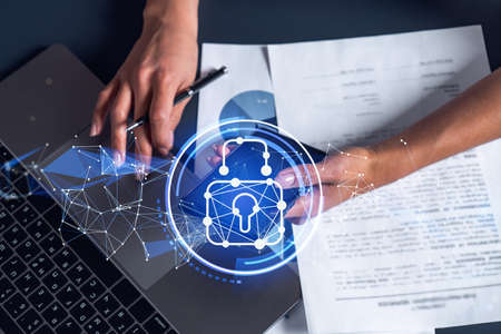 Businesswoman hand using laptop with Data protection, Cyber security secure, information safety and encryption concept. internet technology and business concept.