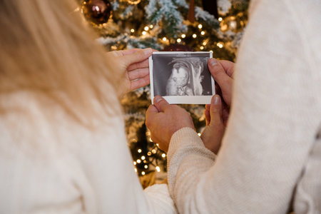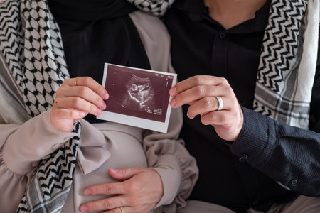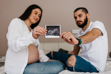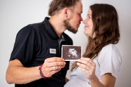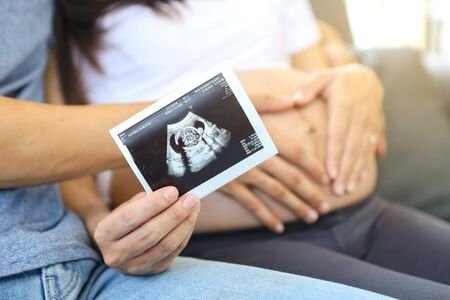 Pregnant couple holding ultrasound scan. Concept of Pregnancy health care.