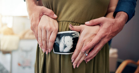 Mother and father holding the baby ultrasound photo. Mum and dad are showing off ultrasound images of their fetus. Heart shaped hand. New born.
