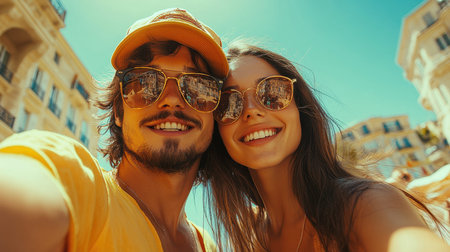 Stylish couple posing for a selfie on a city street during their summer vacation, capturing the excitement of urban exploration.