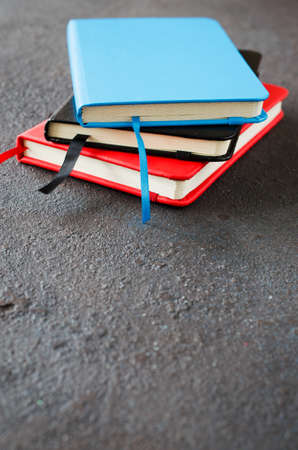 Stack of colorful notebooks for writing or books on dark background.