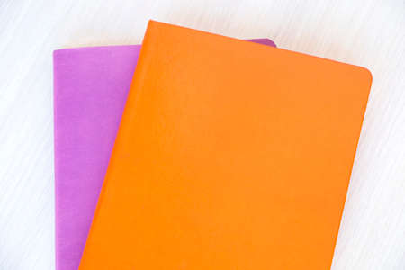 Mockup of the orange and purple books or notebooks with copy space on the table