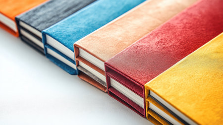 A close-up of a set of multicolored notebooks with different cover textures, placed side by side on a clean, white surface.