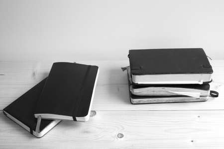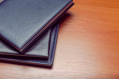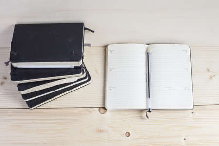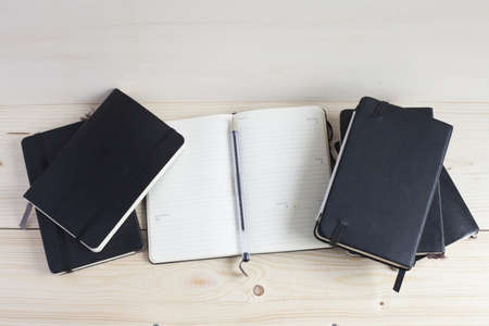 black notepads on brown wood table background