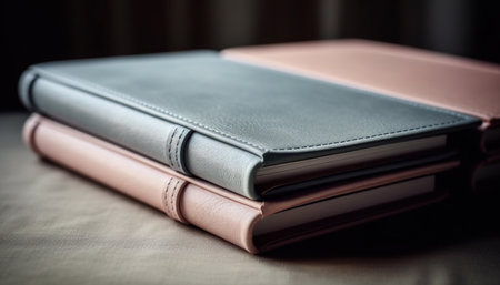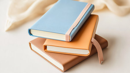 Trio of leather notebooks in blue, orange, and brown stacked neatly on neutral surface with soft ambient light
