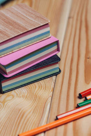 Stack of colored books with stationery stuff on wooden table, selective focus