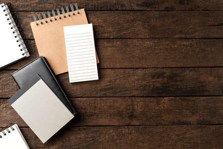 Office desktop concept with various kinds of notebooks on wooden table. Business background