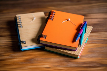 Stack of brown spiral notebooks arranged neatly on wooden desk with soft light