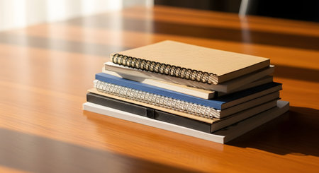 A neat stack of various spiral and bound notebooks resting on a polished wooden table. Sunlight casts soft shadows across the books, suggesting an academic, creative, or business setting ready for work or study.