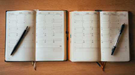 Two open planners placed on a wooden desk, showcasing monthly layouts and pens. Ideal for enhancing organization, productivity, and time management.