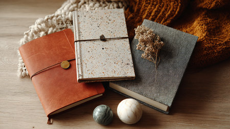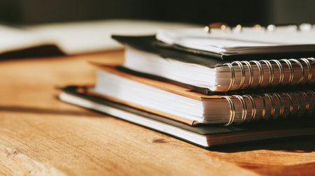 A collection of stacked notebooks rests on a wooden table, illuminated by soft natural light, creating an inviting scene perfect for study, creativity, and productivity.