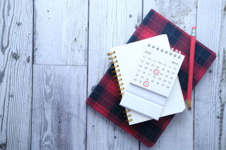 Notebooks and calendar on brown color table. Top view. Copy space.