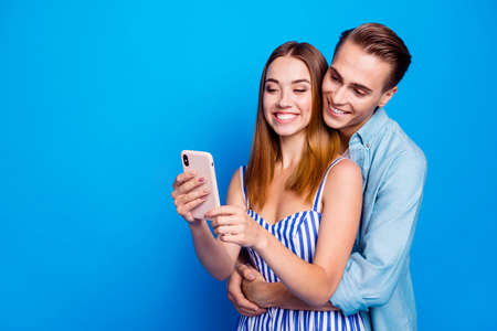 Portrait of his he her she two nice attractive charming cute tender cheerful cheery people hugging using cell browsing media isolated on bright vivid shine vibrant blue color background