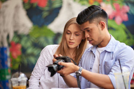 Traveler Asian couple using camera for take a picture while spending holiday trip at Beijing, China, couple enjoy journey at amazing landmark in city. Lifestyle couple travel in city concept.
