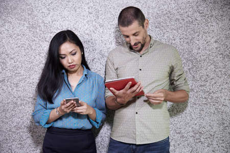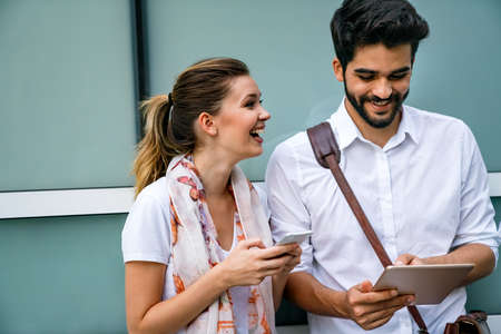 Happy businessman and woman with digital devices outdoors. Business people happiness concept