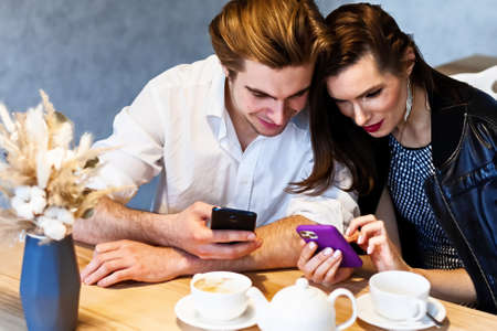 beautiful couple in a cafe at a table drinks coffee and watching something on her phone