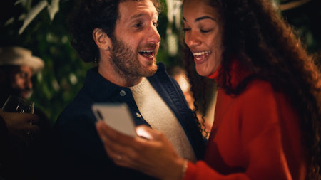 Loving Mixed Race Couple Using Smartphone at an Outdoors Terrace or Garden Dance Party with Friends. Beautiful Man and Woman Look at the Phone, Relax