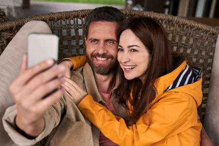 Positive friendly men and women rejoice at their meeting in a cafe, spending free time taking photos with a good mood. Happy couple taking a selfie