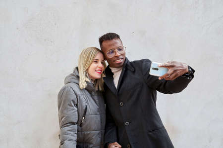 Diverse boyfriend and girlfriend in outerwear smiling and taking selfie against gray wall during date on city street