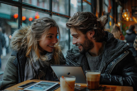A young couple is engaged with their electronic devices at a table in a warmly lit cafe, suggesting a modern relationship dynamic