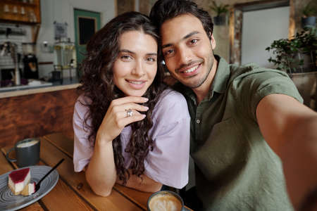 Young cheerful couple looking at smartphone camera held by smiling guy while having cheesecakes and cappuccino during romantic date in cafe