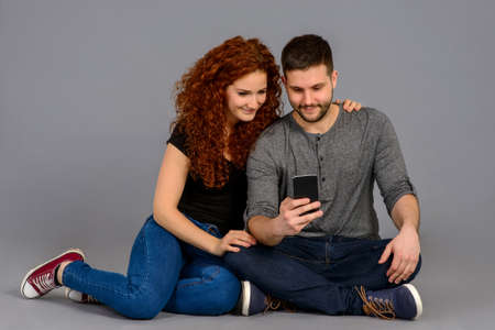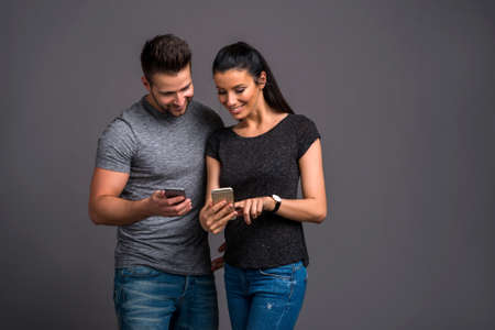 Young smiling couple wearing dark clothes posing naturally taking selfie together with smarphone camera. Studio shot. High quality photo