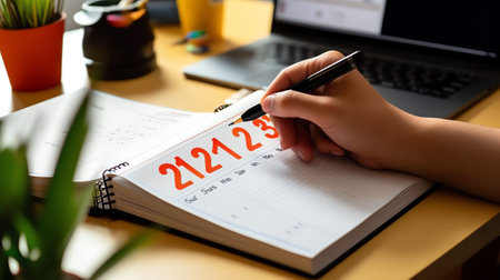 Generative AI : Event planner timetable agenda plan on schedule event Business woman checking planner on mobile phone taking note on calendar desk on office table Calendar event pl