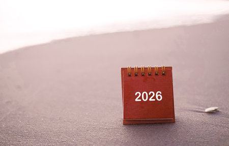 Close up 2026 desk calendar on the beach in the sunset time. Resolution, Goal, Action, Planning, and manage to success business.