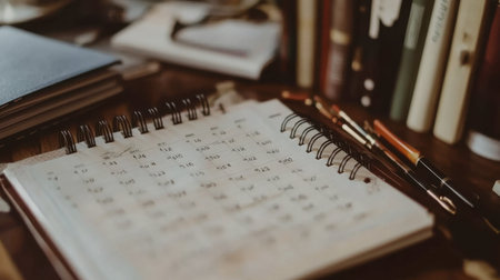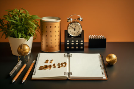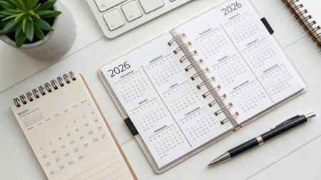 A cozy workspace featuring a calendar and stationery on a desk, perfect for organization and planning. Ideal for illustrating productivity and time management.
