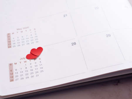Heart-shaped red paper july month in a diary, on grey background.